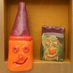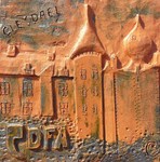 2012werk in bas-relief in opdracht van het Davidsfonds Aartselaar - gemaakt in roodbakkende klei en bewerkt met voornamelijk cobalt - koper en mangaan met een semi matte glazuur erover het werk in ingewerkt in een houten kader welke gekleurd werd met aangepaste kleuren om het werk er te laten uitspringen.